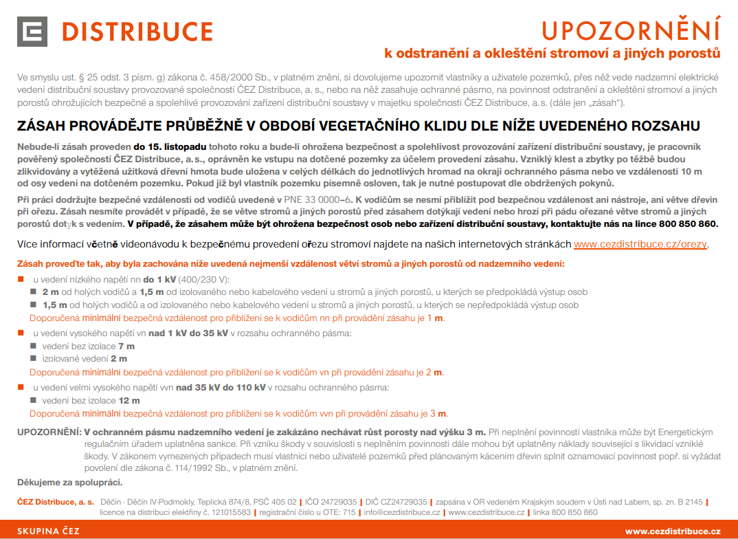 Nebude-li zásah proveden do 15. listopadu tohoto roku a bude-li ohrožena bezpečnost a spolehlivost provozování zařízení distribuční soustavy, je pracovník pověřený společností ČEZ Distribuce, a. s., oprávněn ke vstupu na dotčené pozemky za účelem provedení zásahu. Vzniklý klest a zbytky po těžbě budou zlikvidovány a vytěžená užitková dřevní hmota bude uložena v celých délkách do jednotlivých hromad na okraji ochranného pásma nebo ve vzdálenosti 10 m od osy vedení na dotčeném pozemku.