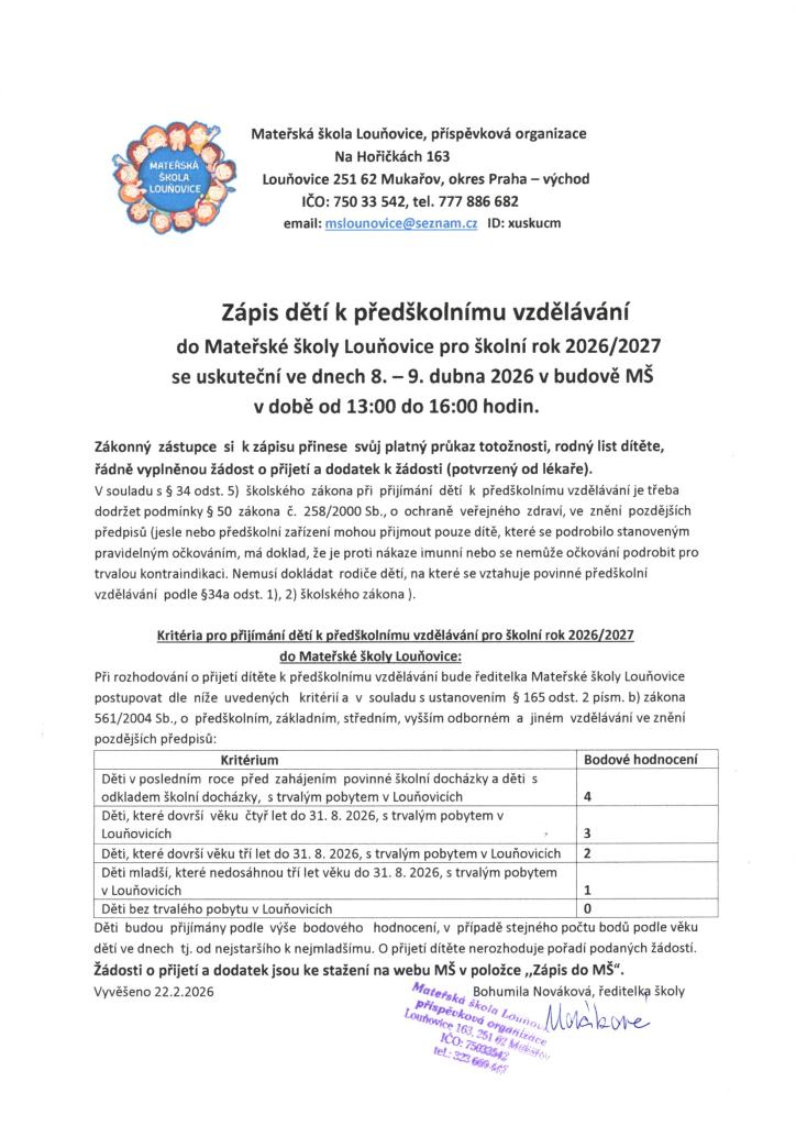 Zápis dětí k předškolnímu vzdělávání do MŠ Louňovice pro rok 2026/2027 se uskuteční ve dnech 8. – 9. dubna v budově MŠ v době od 13:00 do 16:00 hodin.